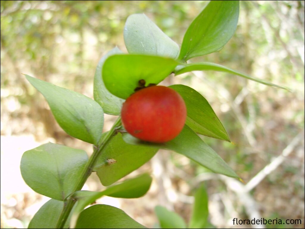 Las flores masculinas presentan tres estambres soldados y las femeninas tienen un pistilo redondeado. El rusco florece a finales del invierno y sus frutos son bayas redondas de color rojizo.