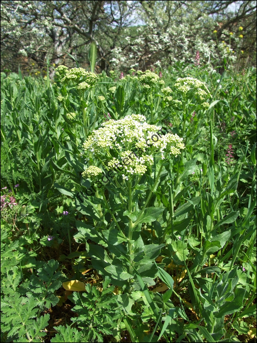 El mastuerzo es una planta vivaz, rizomatosa, de hasta 50 cm de altura, cuyos tallos son erectos y muy ramificados en la parte superior. Sus hojas son oval alargadas con el margen dentado y ondulado, amplixicaules y la base acorazonada; generalmente glabras y de color verde claro. Sus flores miden hasta 6 mm de ancho, son de color blanco y se agrupan en panículas corimbiformes. Su fruto es una silícula indehiscente de forma reniforme o cordada, más ancha en su base. Florece de marzo hasta junio.