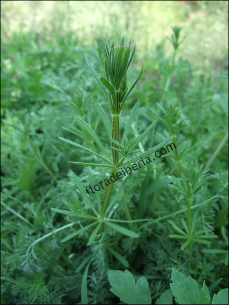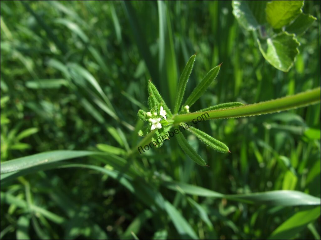 Posee unas hojas linear-lanceoladas, monervadas y acuminadas en el ápice que se agrupan en verticilos de 6-8 alrededor del tallo; estas hojas poseen acúleos en los márgenes que se pegan como velcro a la ropa, pelo o piel.