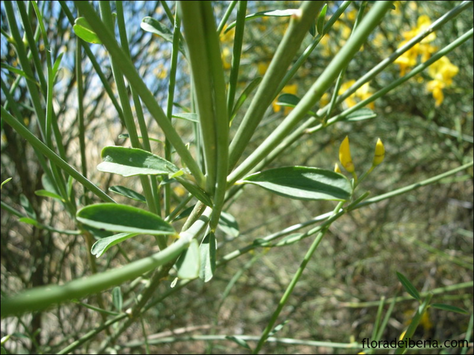 La retama de olor (Spartium junceum) es un arbusto elevado, ramoso e inerme (sin espinas) de 1-3 m de altura con las ramas estriadas que pierde pronto las hojas. Estas hojas son simples, alternas, lanceoladas o elípticas, algo pelosas por el envés y lampiñas por el haz y como se ha dicho: son fácilmente caducas.