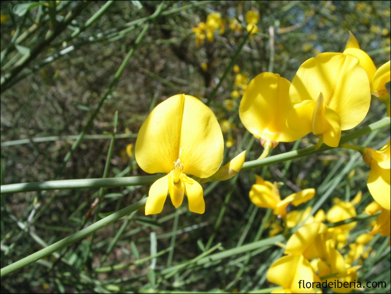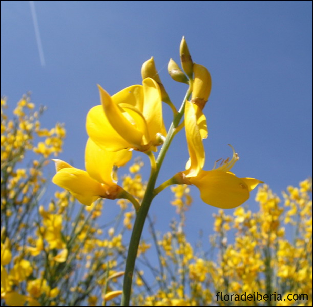 Las flores son grandes, típicamente amariposadas como toda leguminosa, muy olorosas, dispuestas en racimos terminales alargados. El cáliz es membranoso con un sólo labio. La corola es amarilla, amariposada, con estandarte ancho ovado-redondeado rematado en un piquito; la quilla es tan larga como el estandarte y puntiaguda. El fruto es una legumbre comprimida, de un color pardo oscuro. Florece de abril hasta julio.