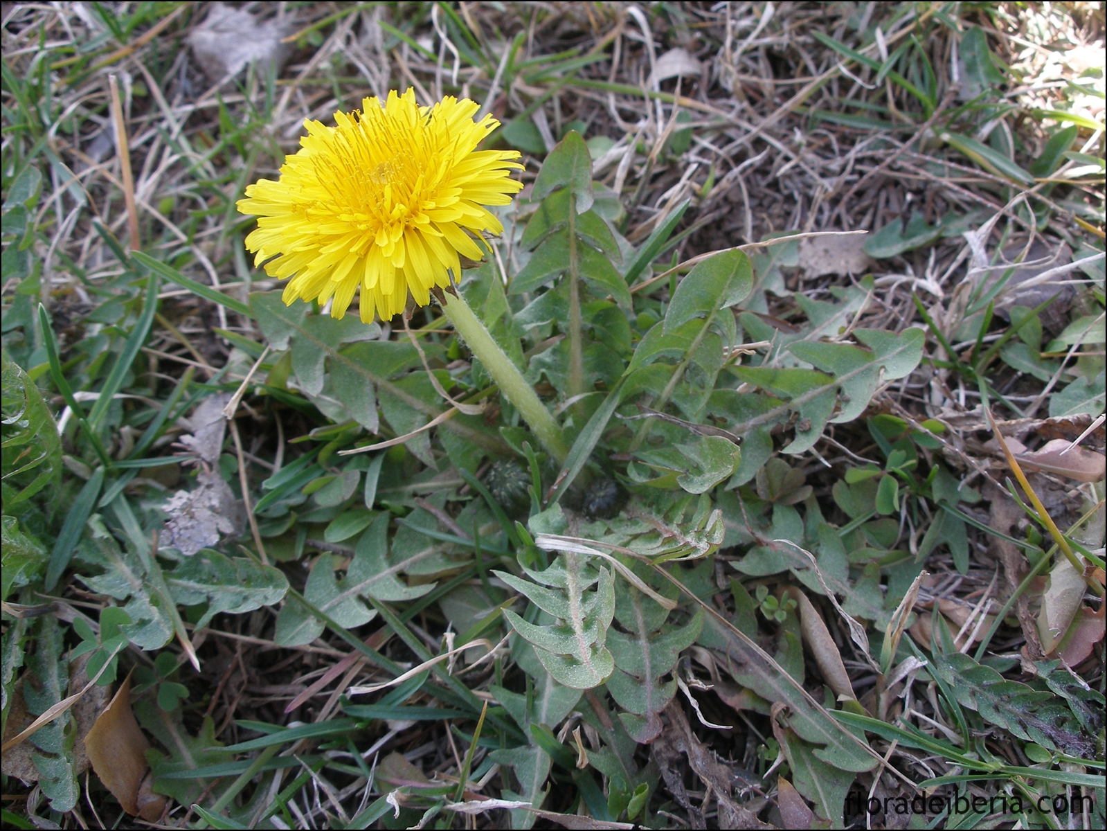 El diente de león (Taraxacum officinale) es una planta herbácea vivaz muy variable con hojas basales en roseta oblanceoladas con pecíolo a menudo alado, con el margen dividido en lóbulos triangulares y dentados dirigidos hacia la base que asemejan un diente. Posee unos tallos lisos de unos 20 cm de altura que cuando se quiebran segregan un jugo lechoso.